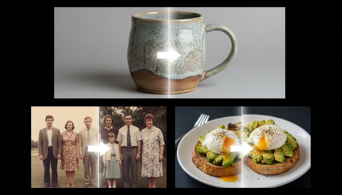 Portrait touch-ups, commercial visuals, old photo cleanup, and creative style edits can all run in the same workspace. This matters for users who start with sharpen and clear image online free but later need broader edits.